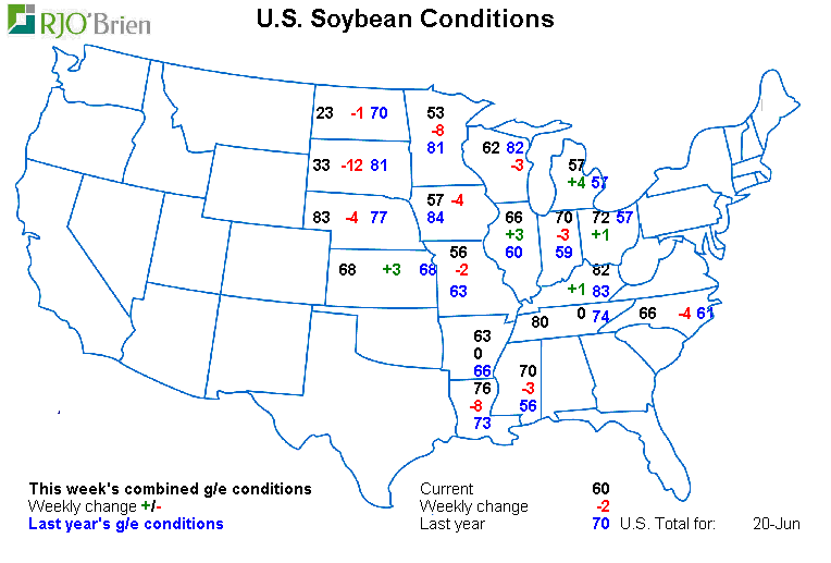 - Conditions du soja 60% bonnes/excellentes vs 60% attendues (58-61% gamme d'idées), 62% la semaine dernière, 70% l'année dernière