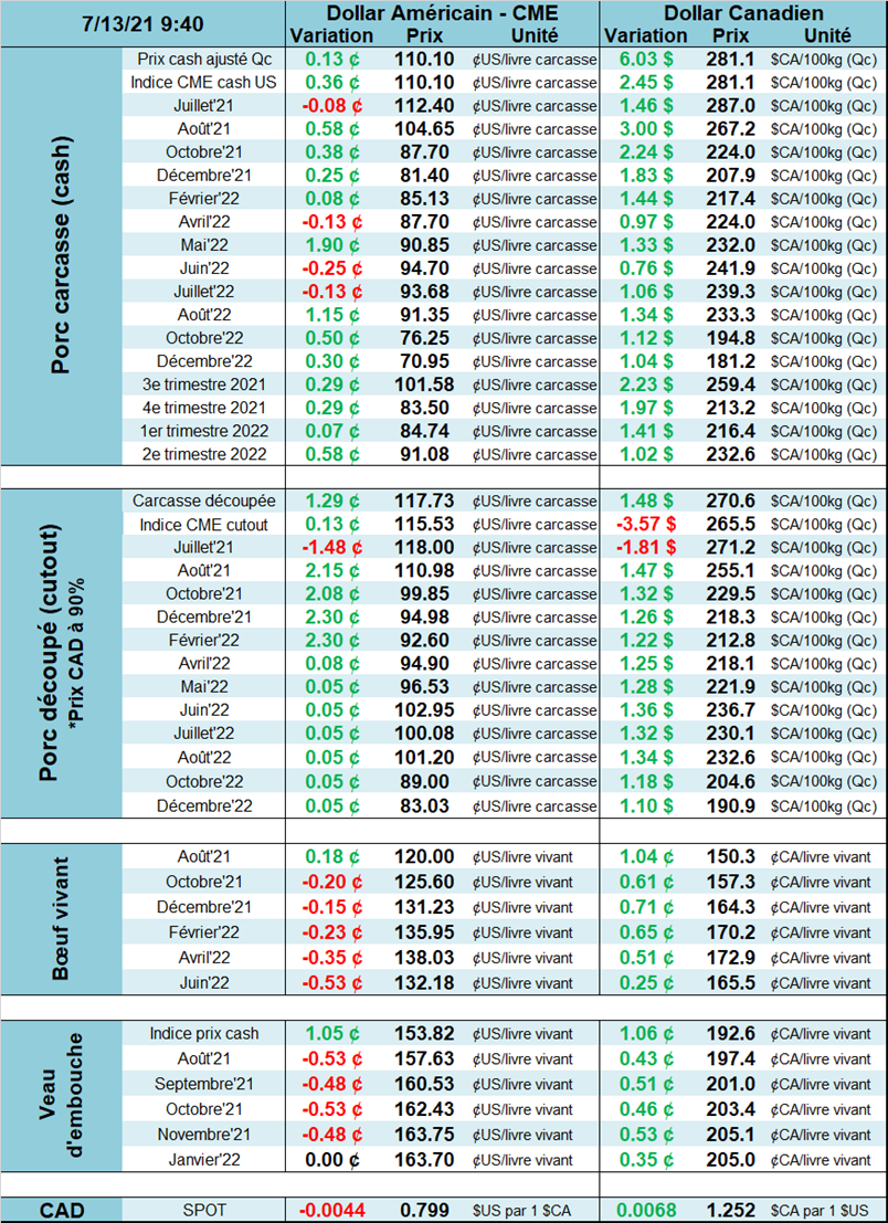 Les acheteurs de porc n’ont pas dit leur dernier mot et essaient de propulser le prix vers les récents sommets. Le contrat de juillet manquera de temps pour se rendre vers le niveau de $1.20 USD / lb, mais le simple fait de provoquer des flammèches dans le marché est un exploit. Pourquoi une hausse aussi forte ce lundi? Il n’y avait pourtant rien de particulier à rapporter sinon quelques nouvelles ça et là, mais ces nouvelles, mises bout à bout, pourraient justifier la remontée.