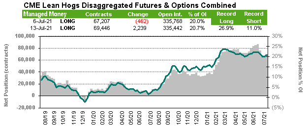 Du côté des spéculateurs, ils ont acheté un total de 2239 contrats entre le 7 et 13 juillet, ajoutant sur le rebond du prix. La position totale des spéculateurs est de presque 70,000 contrats, au centre de la fourchette des derniers mois (entre 60,000 et 80,000 contrats achetés).