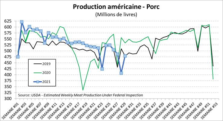 La production de porc de la semaine dernière demeurait faible aux États-Unis, à peine en ligne avec la moyenne quinquennale. Évidemment, les chiffres de 2020 sont gonflés par le rattrapage des porcs en attente du printemps 2020, mais on ne peut pas nier que la production des dernières semaines est en deçà des prévisions du Hogs & Pigs de juin. Alors que l’USDA dévoilait un troupeau 1.5% plus faible qu’en 2020 au 1er juin pour les porcs de 120-179 lbs, on voit les abattages être 9.4% en dessous du volume de l’an dernier avec 2.28 millions têtes. Le poids est similaire à l’an dernier ce qui donne une production 479 millions de livres.