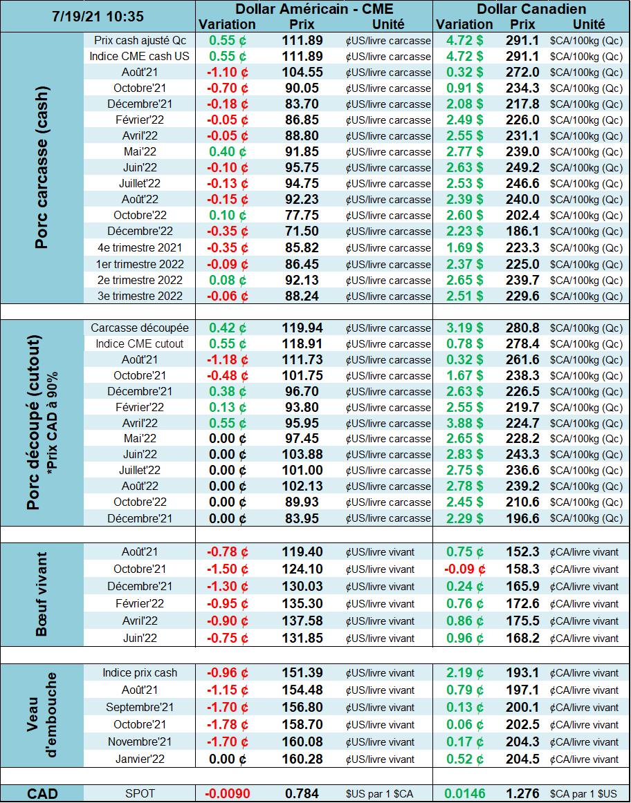 Ses annulations d’exportation sont possiblement expliquées par le fait que la Chine ne manque pas de viande de porc. La production chinoise de porcs au 2ème trimestre a été de 13.46 millions de tonnes, soit 40% de plus qu’à pareille date l’an dernier et à un record depuis au moins les 7 dernières années. La croissance de la production provient du démarrage de plusieurs nouveaux sites des principaux producteurs chinois et faut s’attendre à ce que la croissance continue puisque d’autres sites sont toujours en construction. Cette augmentation de production explique la chute du prix cash en Chine, baissant d’environ 150 $US/100kg durant le 2ème trimestre. Présentement, le prix est à 243 $US/100kg, en ligne avec les prix pré-PPA.