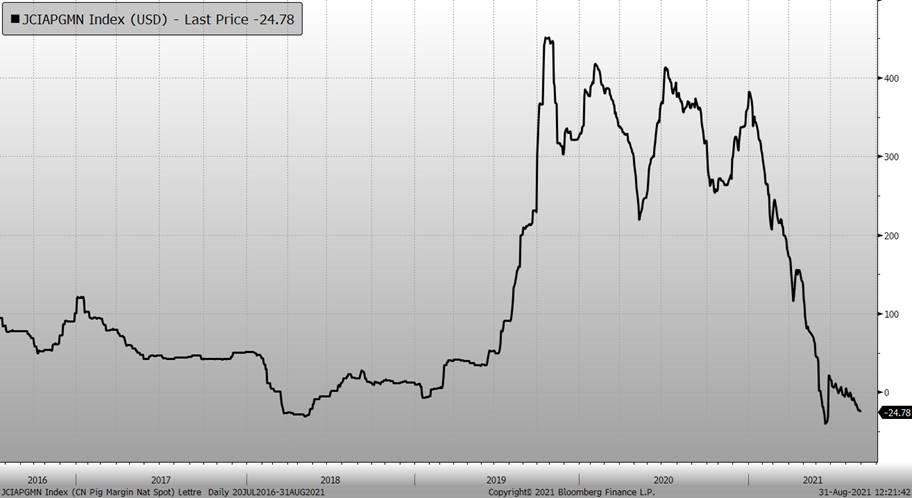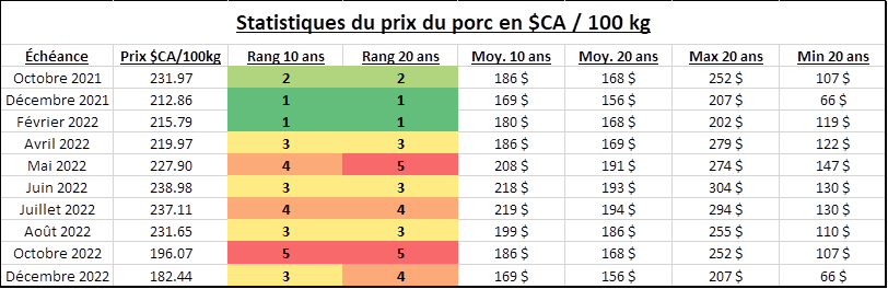 Le prix du grains touche de nouveau creux cette semaine, sous la pression de la nouvelle récolte et de l’ouragan Ida qui va restreindre l’exportation cette semaine. À mon avis, mieux vaut profiter des prix qui sont encore élevés à la bourse : décembre @ 211 $CA/100kg, février @ 214 $CA/100kg et avril @ 218 $CA/100kg, parce que si le prix baisse et que les perspectives de profitabilité pour 2022 s’améliore pour l’élevage américain, il faudra s’attendre à une croissance rapide du troupeau américain. Le niveau de prix pour cet hiver à Chicago en $CA/100kg serait des niveaux records, ce qui n’est pas à négliger.