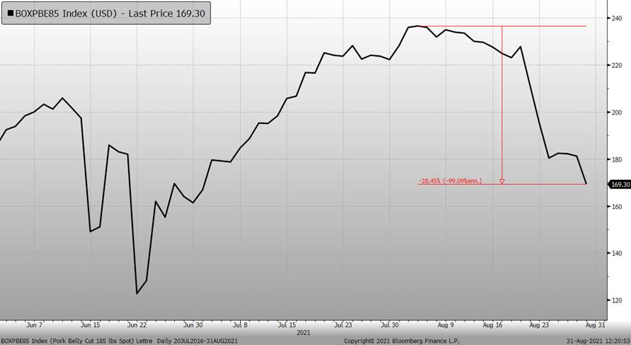 Les prix à la bourse n’ont pas de tendance claire depuis 1 mois. La volatilité du prix des découpes cause des maux de tête aux traders envoyant plusieurs faux signaux… une journée, le cutout baisse de 8 cents et deux jours plus tard, la valeur de la carcasse rebondie par 6 cents. Chose certaine, c’est que la pression saisonnière commence à se faire ressentir et la valeur de la carcasse découpée a chuté à son plus bas niveau en plus de 2 mois hier, à 109.72 cents/lb. Une bonne indication que l’été est fini et que les enfants retournent à l’école est le prix du bacon, en baisse de 12 cents hier, à 169 cents/lb, comparativement à 236 cents/lb au début août.