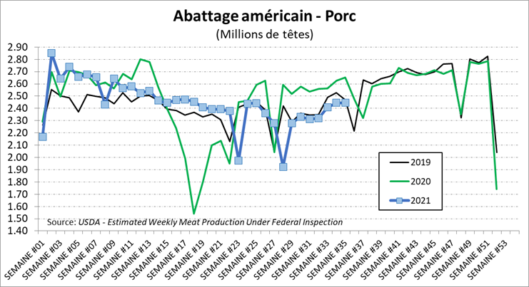 Concernant la production américaine de la dernière semaine, la cadence suite toujours celle de 2019 avec une hausse saisonnière des abattages. La semaine dernière, les abattages étaient de 2.44 millions de têtes, inchangés par rapport à la semaine précédente. Avec un poids moyen de 209 lbs/carcasse, la production était de 511 millions lbs, en baisse de -8% versus 2020, mais seulement -0.4% versus 2019. Le rattrapage du retard des abattages de 2020 se terminait vers le mois de septembre l’an dernier (en même temps que le début de la tendance haussière du prix), on devrait donc être en ligne avec la production de 2019 et de 2020 d’ici quelques semaines. Autrement dit, il n’y a pas moins de porcs que les 2 dernières années, mais l’absence de croissance du troupeau depuis 2 ans n’a pas permis de suivre la demande.