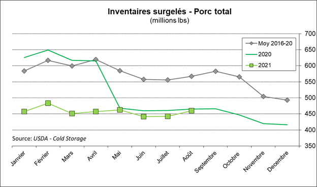 Le USDA rapportait les données de Cold Storage hier. Au 31 août, les inventaires de viandes de porc se situaient à 460 millions de livres aussi de 4% par rapport à juillet, mais en baisse de 1% par rapport à août 2020. Par conséquent, les stocks ne trouvent toujours une tangente positive et plus le temps avance et plus on s’habitue à conserver des stocks très serrés.
