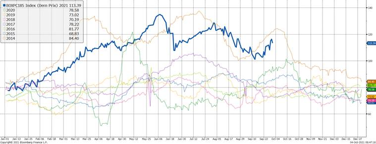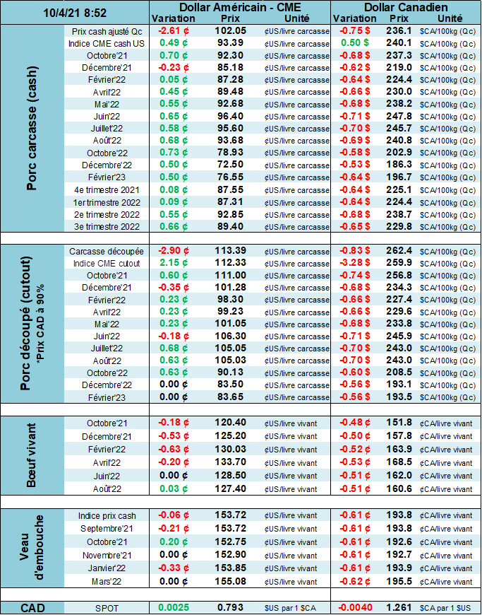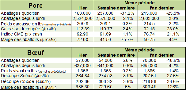Suite au rapport Hogs & Pigs, le marché va maintenant regarder de près les abattages hebdomadaires afin de vérifier si les projections de l’USDA sont justes. Pour l’instant, on dirait bien que c’est le cas. Les abattages de la semaine dernière était de 2.52 millions têtes, soit 3.4% de moins que l’an dernier. Cependant, le poids est beaucoup plus faible qu’en 2020, à 210 lbs versus 214.5 lbs/carcasse, ce qui crée un déficit de 2% dans la production de viande. En somme, la production de la semaine dernière était de 529.5 millions de livres, soit 5.5% de moins que l’an dernier.