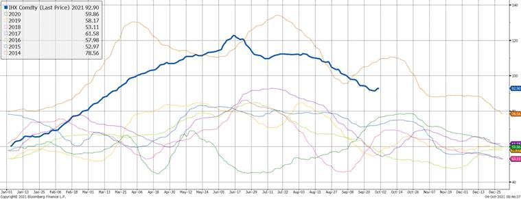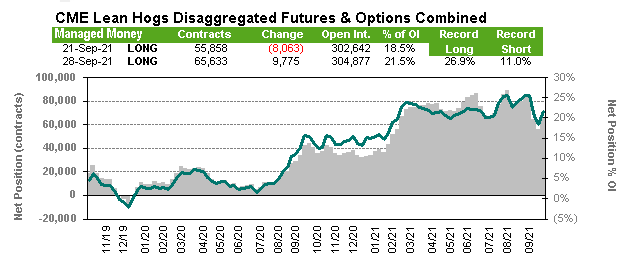 Alors que les spéculateurs étaient en mode « liquidation » de leurs positions d’achat depuis quelques semaines, on voit qu’ils ont rapidement changé d’idée après le rapport Hogs and Pigs. Dans la semaine se terminant le 21 septembre (avant le rapport), les spéculateurs avaient liquidé 8,000 CàT pour une position nette d’environ 56,000 CàT. Après la publication du rapport, pour la période du 22 au 28 septembre, ils en ont racheté 9,775 contrats pour ramener leur position à 65,600 CàT et cela inclus seulement 2 jours de trading « post-rapport ». Il ne serait pas surprenant qu’ils aient continué à racheter des contrats les jours suivants.