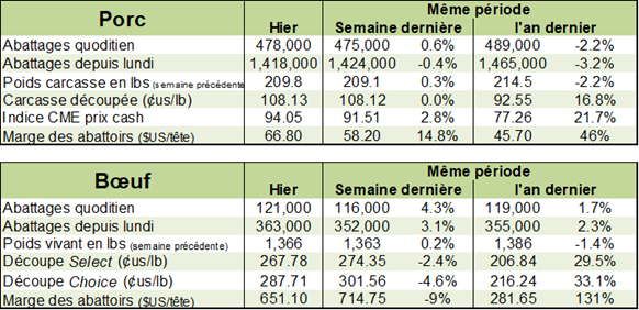 Le USDA regarde l’idée d’offrir des passe-droit pour accélérer la cadence d’abattages aux abattoirs qui peuvent démontrer que la sécurité des travailleurs est respectée et que le contrôle des bactéries se fait de façon efficace. Trump avait permis l’accélération des abattages, les inspecteurs du USDA et les travailleurs avaient gagner leur cause en cours et avaient réduit le rythme, mais voilà que le USDA veut contourner le tribunal. (https://www.thepigsite.com/news/2021/10/usda-secretary-mulls-waivers-for-pork-plants-forced-to-use-slower-line-speeds) Le rythme pourra vraisemblablement changer usine par usine au cours des prochaines semaines. Si jamais cela s’avérait, il ne faudrait pas se surprendre de revoir une demande plus forte pour les porcelets et éventuellement une offre de porcs plus élevés de la part des producteurs.