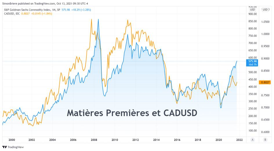 Tous des facteurs et symptômes d’une forte inflation. Aussi, cette inflation dans les matières premières donne de la force au dollar canadien – bien que plus diversfié qu’anciennement, le Canada est toujours un exportateur important de matière première.