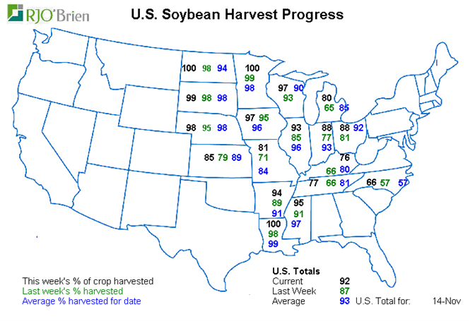 - Soja récolté 92%, 87% la semaine dernière, 93% en moyenne