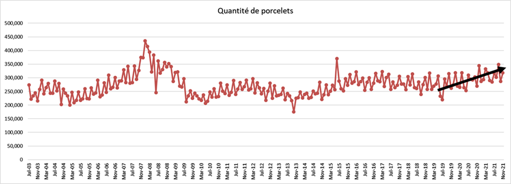 La rétention des truies- Les Etats-Unis ont consacré beaucoup d’efforts à étudier la perte des truies depuis 1 an maintenant en raison de diverses maladies ou encore de la Covid. Les producteurs sont probablement sur le point de mettre à contribution toutes les truies restantes afin de produite davantage de porcelets dans les prochaines semaines. Cette donnée sera TRÈS importante à suivre puisque nous pourrons déceler la craque dans l’armure des prix futurs (octobre / décembre 2022 / février 2023). On peut constater que, il y a quelques semaines, les producteurs n’envoient plus autant de truies vers les abattoirs. Un signe que la profitabilité est telle que les producteurs veulent augmenter leur production future?