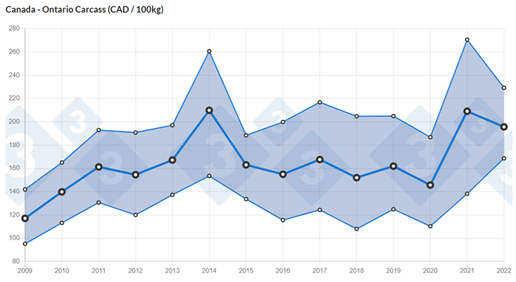 Le site www.pig333.com s’est amusé à demander aux producteurs des différents pays quel prix ils s’attendent d’avoir pour leurs porcs en 2022. Au Canada, voici le tableau des estimations. Les prédictions : prix moyen de $195.66 CAD / 100 kg. On peut comparer les attentes de l’an dernier (2021). Les producteurs étaient plutôt pessimistes aux Etats-Unis en 2021. Finalement, les prix ont été nettement meilleurs que leurs estimations.
