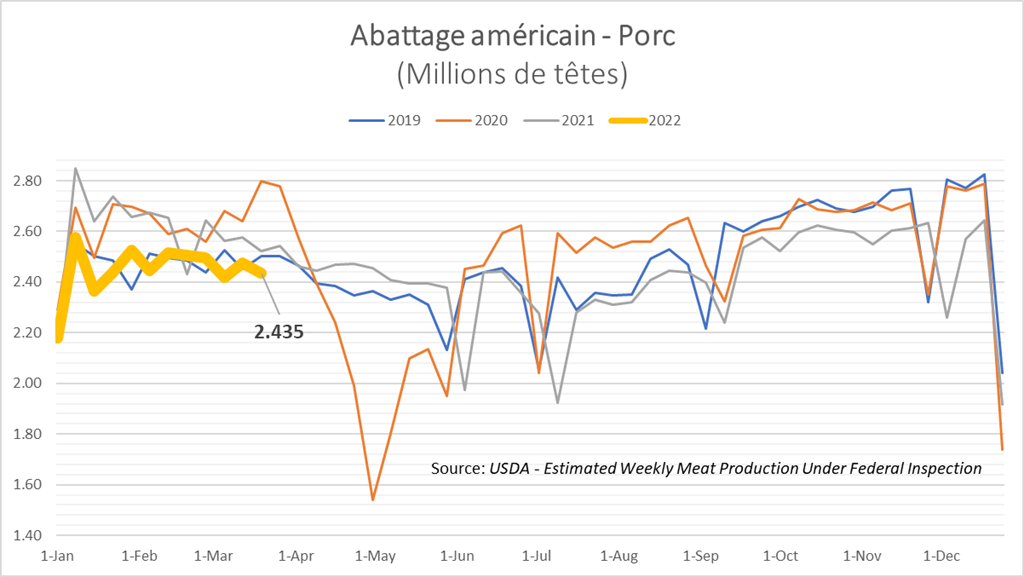 Le lendemain (31 mars), nous aurons les intentions de semis. Évidemment, le cours des grains aura une très grande influence sur les prix du porc pour la fin de 2022 et en 2023. Vraiment, ne rangez pas vos tuques (parce qu’on annonce froid lundi!) et attache-là avec de la broche parce que les soubresauts sont loin d’être terminés.