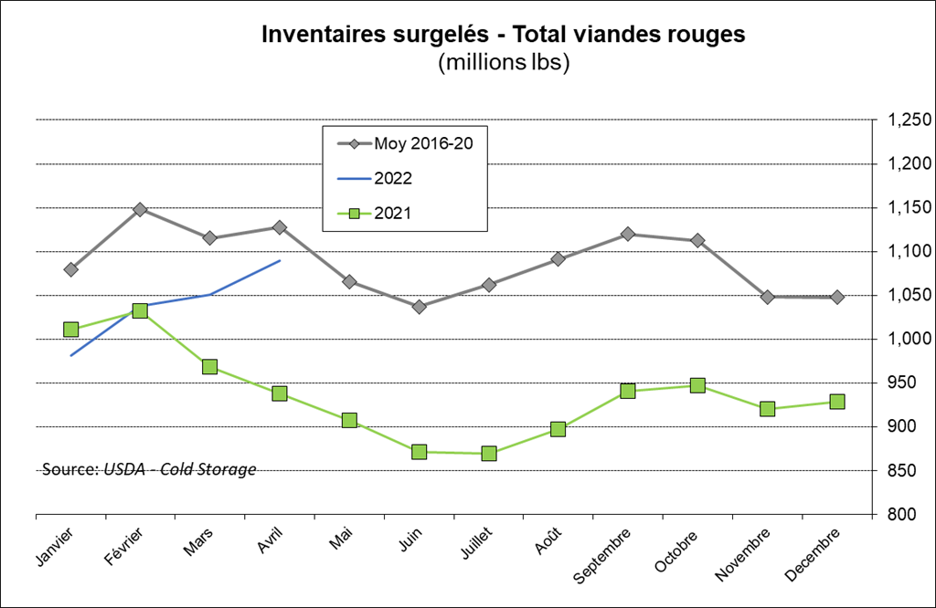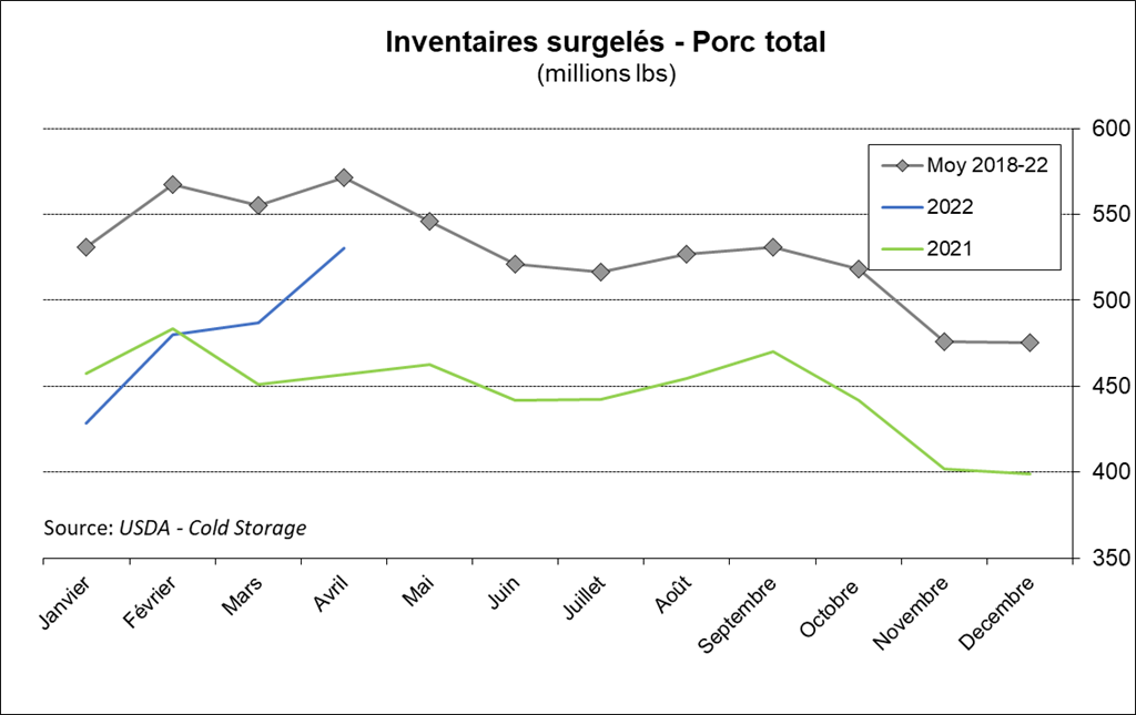Un indice que l’offre de viande a surpassé l’offre le mois dernier (ce qui vient justifier la baisse des prix) c’est la hausse des inventaires de viande de bœuf et de porc le mois dernier. Le rapport Cold Storage a démontré que les stocks commencent à se reconstituer tranquillement. Une offre supérieure, une demande moins forte et voilà la résultat.