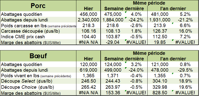 La découpe après avoir relevé la tête la semaine dernière, a perdu pied vendredi ave une baisse de 1.97 USD / 100 livres. Si on veut justifier des prix élevés cet été, il faudra que la découpe commence à grimper au cours des prochaines semaines. Il y a de la place si on se fie aux années antérieures.