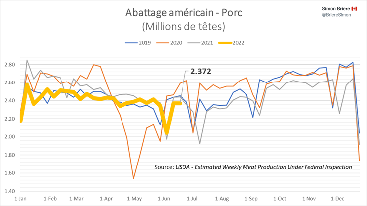 Pour revenir à l’abattage moyen aux Etats-Unis, la semaine dernière représente un point d’ancrage intéressant puisque c’est la première semaine de forte baisse du nombre de porcs abattus depuis près de 2 mois. Déjà, cette semaine, nous avons 24 000 porcs de moins abattus par rapport à la même semaine en 2021 ou 2.55% en dessous de l’an dernier. Ces petits pourcentages pourraient faire toute la différence sur le prix du porc au comptant cet été. Déjà que les contrats de juin ont été décevants, il est possible que ceux de juillet et d’août puissent nous apporter une relative rentabilité au cours des prochaines semaines. Pour cela, il faudra une bonne demande et conséquemment il faudra voir comment les données du Cold Storage pourront supporter nos attentes (rapport le 23 juin).