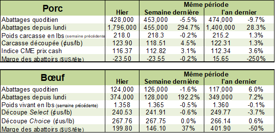 Les données d’abattages quotidiennes devraient être une source de préoccupation pour les abattoirs. Nous avons 70 000 porcs de moins que l’an dernier. Évidement l’abattage du samedi pourra combler une partie de ce retard, mais cela demeure significatif comme baisse si celle-ci demeure. En pourcentage, cela signifie 3.75% de moins! Nous sommes bien loin du fameux 1% de baisse anticipé. Au risque de me répéter, il faut attendre les données du samedi pour conclure quoi que ce soit!