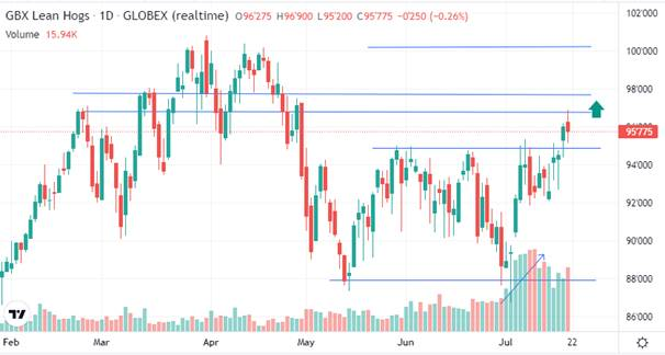 Le porc essaie tant bien que mal de supporter la pression baissière sur les commodités. Le fait d’avoir surpasser certaines résistances techniques sur les graphiques devaient ou devraient normalement faire grimper les prix à des niveaux supérieurs. Le contrat d’octobre par exemple a bien tenté durant la journée de dépasser le niveau de $97 USD /100 livres, mais en vain. Tout de même c’est un premier objectif technique atteint. Le 2ieme sera plus important et se sera le niveau de $97.75 USD / 100 livres. C’est encore possible de l’atteindre au cours des prochains jours.