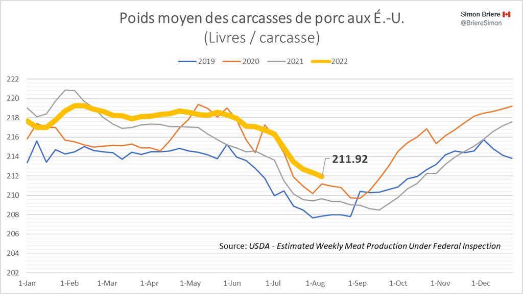 La semaine dernière, le USDA a rapporté que les producteurs avaient vendu 8000 porcs de plus qu’en 2021 pour la même semaine. Le poids moyen des carcasses est sensiblement le même qu’en 2021.