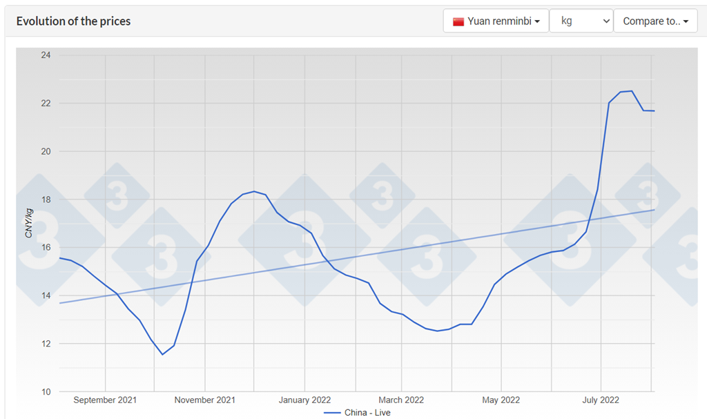 En juin et juillet, les analystes ont beaucoup parlé des prix du porc en Chine qui grimpaient. Étrangement, les contrats à terme chinois sur le porc ont perdu 3% lundi. Ceci fait suite, à des pertes de quelques pourcentages la semaine dernière. Nous suivrons attentivement si la descente se poursuit, se sera un bon indice de ce qui peut se passer en Amérique du Nord.