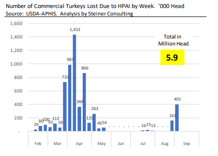 La seule nouvelle récemment est la baisse des prix de l’essence et la diminution lente de la valeur de certaines commodités aux États-Unis. Le consommateur obtient un répit, mais le coût de certains services sont soudainement plus chers et les coûts d’emprunt aussi. Bref l’inflation n’a pas terminé de jouer dans notre portefeuille. Et que dire de la récession qui vient… tous ces éléments pourront-ils venir à bout des prix des viandes? Les prix du bœuf viennent d’atteindre presque des sommets en 2022 et les prix de ce produit pour les échéances de 2023 flirtent avec les sommets historiques… Alors peut-on voir le prix du porc s’enfoncer ou se maintenir quand on regarde le prix des autres viandes? Que dire de la résurgence de la grippe aviaire qui revient en force depuis août. Aux États-Unis, après les événements du printemps on pensait en avoir terminé avec cette maladie, mais non, la Californie sonne l’alarme et voilà que la maladie revient dans le Midwest. L’année 2015 était l’année de tous les records en terme de pertes d’animaux (volailles)…. Il est bien possible que 2022 soit maintenant la nouvelle référence.
