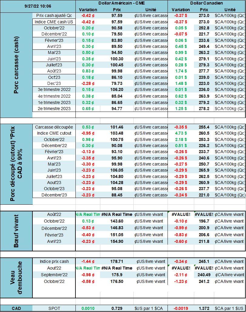 Le sentiment négatif qui secoue les marchés financiers est venu perturber le prix du porc. Les prix des contrats à terme ont tous fortement chuté sous l’effet domino de toutes les autres commodités. Il n’y avait rien de spécifique au porc pour le faire baisser autant, mais le sentiment de panique se sent bien sur les marchés ces temps-ci. Je vous en parlais la semaine la FED est très agressive sur les hausses de taux d’intérêt quitte à faire dérailler l’économie générale. Il faut mater l’inflation coute que coute. Encore une fois, il faudra des mesures cibler pour enrayer ces problèmes. Plusieurs commodités et certains services ont perdu plus de 50% de leur valeur depuis 9 mois et pourtant certains détaillants nous font accroire que les prix augmentent toujours! Il est vrai qu’avec les hausses des taux d’intérêt il est plus lourd de supporter des inventaires (souvent payés à crédit…) Donc tout ça pour dire que si le porc baisse ce n’est pas tant en raison de l’offre de viande, mais plutôt les soubresauts financiers que nous subissons. La demande (des consommateurs) peut être aussi affectée en cette période trouble, mais cela reste à voir.