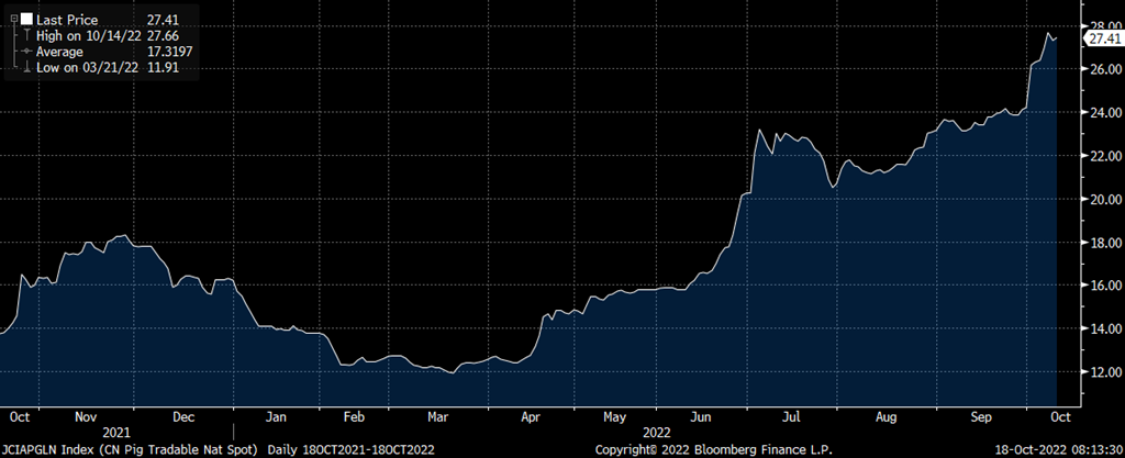 Je dois de terminer ce court extra-viande en discutant des prix du porc en Chine. Les données d’exportations rapportées à chaque jeudi matin parle USDA deviennent soudainement plus excitantes puisque depuis 2 semaines, la Chine est présente sur ces chiffres. La Chine a, en effet, acheté 10 000 tonnes et 5000 tonnes depuis les 2 dernières semaines aux Etats-Unis. Au même moment, l’État chinois libérait plusieurs milliers de tonnes des inventaires dans le but de freiner l’augmentation des prix sur son territoire. Les autorités ont-elles réussi à freiner le prix? Le graphique ci-dessous devrait vous convaincre que non. Mais les choses changent des fois! C’est un sommet des 2 dernières années! Les festivités entourant le régime communiste chinois viennent de se terminer et il sera important de voir la réaction des prix du porc au cours des prochains jours pour déceler si le party est vraiment terminé.