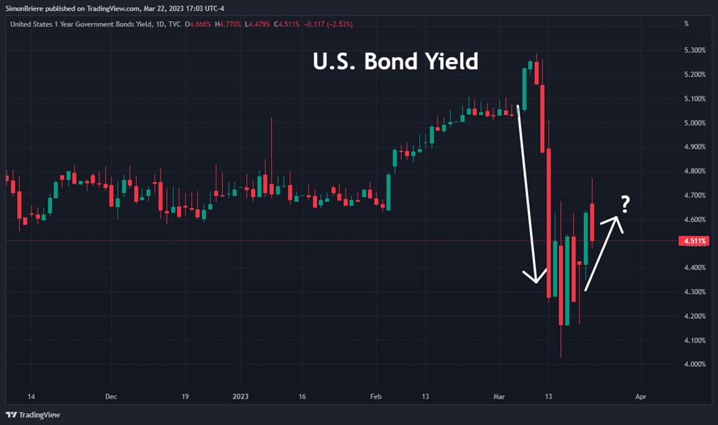 3 La réserve fédérale (la Banque du Canada aussi) nous dit depuis un temps que cette période est révolue, qu’on est dans un resserrement monétaire. Mais c’était avant le fiasco des banques comme Silicon Valley Bank (SVB) et le gouvernement fédéral a dû venir en aide. Je simplifie, mais c’est pas mal ca pareil. À ce moment tout le monde pensait que le QE est de retour! Que le cheap money allait revenir! Make it Rain! Les taux vont bien chuter! Not so fast…