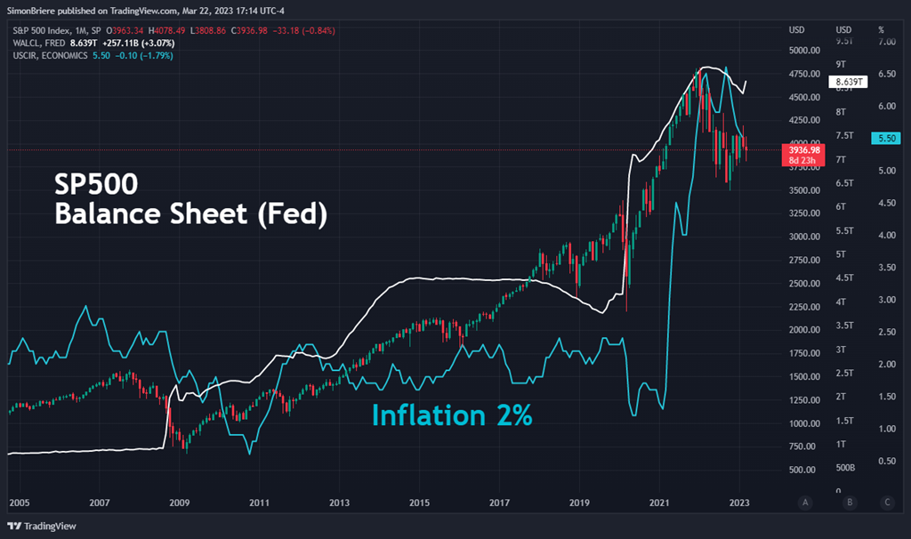 5 Bon, tout ça est assez important pour les marchés financiers – les indices boursiers particulièrement. Quand le fric est abondant, quand les taux d’intérêts sont bas, le stock market va bien. La corrélation est assez évidente; plus le bilan gonfle, plus le SP500 s’apprécie. Si bilan se dégonfle… est-que la bourse aussi? On est dans l’inconnu et les avis sont partagés.