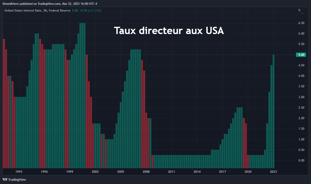 1 L’environnement financier est turbulent, c’est le moins qu’on puisse dire… La réserve fédérale a augmenté les taux d’intérêt de 0.25% (25 points de base, dans le jargon!). À 5% c’est le taux de plus élevé depuis 20 ans. La derniers fois qu’on était là c’est au début des années 2000. J’étais à l’université, et le rappeur 50 Cent venait de sortir « Candy Shop ». Avec l’inflation je me demande si 50Cent est devenu 1Dollar. Tou-doum-chi, joke de papa. Sorry.