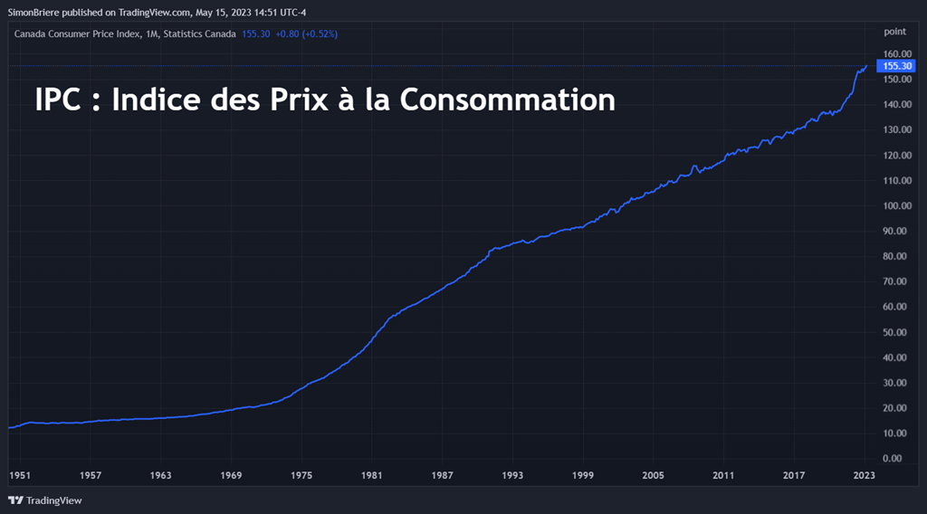 Quand on regarde l’inflation, on l’exprime en pourcentage. C’est-à-dire qu’on isole deux années pour voir de quelle manière les prix ont fluctué (augmenté). Le panier de biens qu’on compare d’une année à l’autre c’est l’IPC (Indice du Prix à la Consommation, IPC). En gros, l’IPC monte tout le temps, c’est normal. Les salaires augmentes d’année en année, le prix des biens des affaires aussi. C’est logique. C’est pour ça que Grand’Pa s’achetait une livre de beurre, une douzaine d’œuf une pinte de lait pis un pain tranché pour à peine trente sous. Aujourd’hui ça doit être 20 piasses, LOL. Peut-être plus? Pis il lui en restait surement pour s’acheter des bonbons. M’enfin, un autre temps.