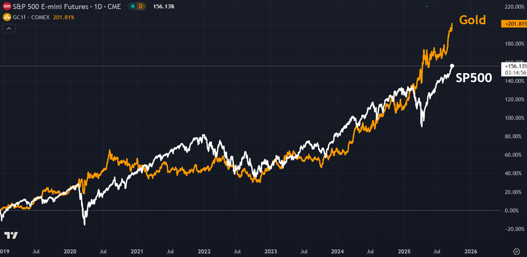 Pour mettre les choses en perspective, en 2019, l’indice S&P 500 se situait à moins de 3 000 points. Il atteint aujourd’hui près de 6 700 points, soit une hausse de plus de 156 %. Dans le même temps, l’or est passé de 1 500 $ à 3 760 $ l’once, une augmentation de 200 %. Autrement dit, depuis 2019, un dollar investi dans l’or a offert un meilleur rendement qu’un dollar placé dans l’indice phare de la bourse américaine, qui lui-même pousse les records en record en record. Une rare séquence où la valeur refuge surpasse le marché des actions.