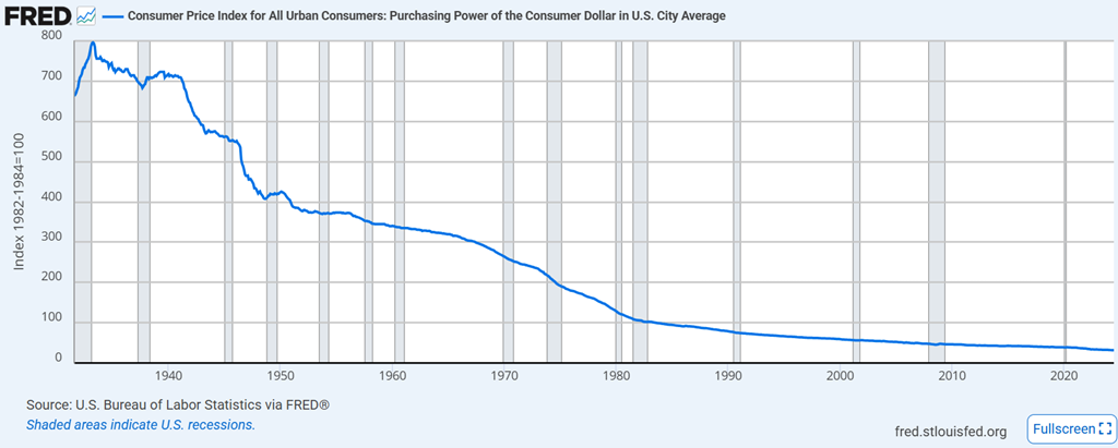 Selon les données de la Fed de St-Louis, le pouvoir d’achat du dollar américain a chuté de plus de 70 % depuis 1980 – même plus de 90% si je recule à la fin de la 2e Guerre Mondiale. Concrètement, ce qu’on pouvait acheter avec 100 $ il y a 40 ans nécessite aujourd’hui plus de 300$. Ou encore, avec 100$ aujourd’hui, on ne peut plus acheter 70% des choses qu’on pouvait se procurer avant. En gros, tu ne vas plus très loin avec 100$ aujourd’hui… L’or, lui, a suivi la trajectoire inverse ; il s’est apprécié, protégeant ainsi contre cette dépréciation monétaire. Bref, la valeur de l’or augmente tandis que la valeur du dollar (américain, canadien, euro) s’effrite à chaque année ou l’inflation passe.