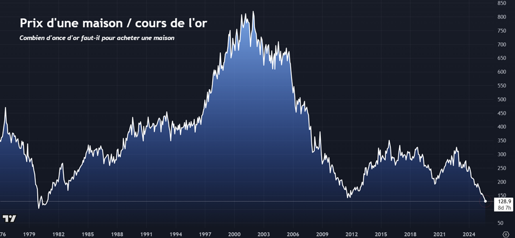 La comparaison avec l’immobilier en dit encore plus long. En 1981, une maison moyenne aux États-Unis coûtait environ à peine 60 000 $. Au prix de l’époque (environ 350 $ l’once), il fallait 170 onces d’or pour acheter une maison. En 2025, une maison moyenne vaut autour de 600 000 $. Au prix actuel (3 760 $ l’once), il faut environ 159 onces d’or. En d’autres termes, en plus de quarante ans, le prix des maisons a été multiplié par 10x en dollars… mais exprimé en or, il resté essentiellement le même à quelques onces près. L’or n’est donc pas seulement un actif de refuge : c’est aussi une unité de mesure de la valeur réelle à travers le temps. Évidemment tout cela n’est pas statique, parfois c’est plus, parfois c’est moins. Dans la folie immobilière aux États-Unis, il fallait plus de 700 onces d’or pour acheter une maison! Le marché était en pleine ébullition et on s’est ce qui s’est passé par la suite… Actuellement c’est le contraire- on pourrait même se poser la question si l’or n’est pas « trop cher » ou qu’un (autre!) boom immobilier et sur le bord de se produire.
