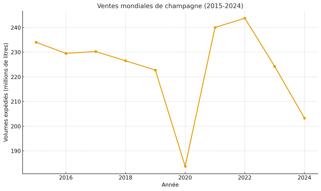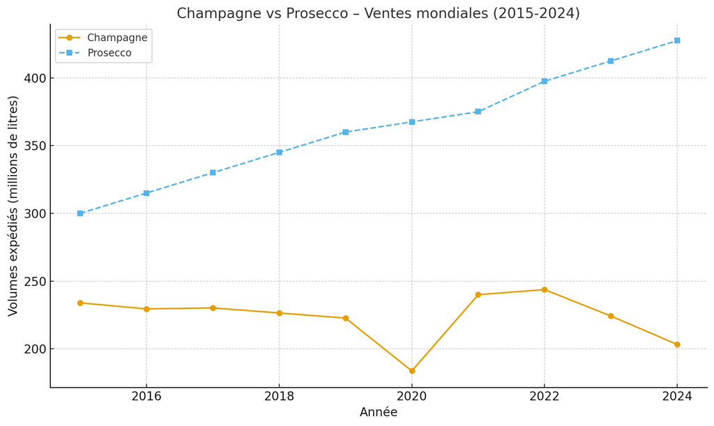 Voici le comparatif Champagne vs Prosecco (2015–2024) en volumes mondiaux. On y voit le contraste : le champagne stagne puis recule après 2022 (On voit bien le creux marqué en 2020 lors de la pandémie, puis le rebond en 2021-2022 quand on a eu le droit de (re)faire le party, puis le net recul depuis 2023.. Le prosecco, lui, progresse presque chaque année et dépasse largement le champagne en volume.
