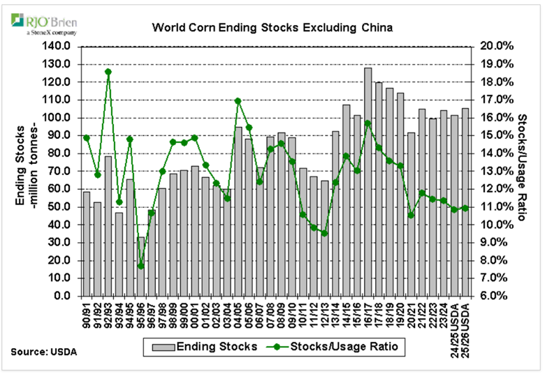 En absolu, les inventaires sont élevés avec 107 millions de tonnes, mais la consommation vient masquer la réalité de l’abondance avec à peine un ratio de 11% (excluant les données chinoises). Et la situation pourrait se dégrader avec une baisse des rendements aux Etats-Unis dans 3 semaines (rapport final du USDA pour 2025). Et ce n’est pas les producteurs sud-américains qui combleront le manque à gagner.