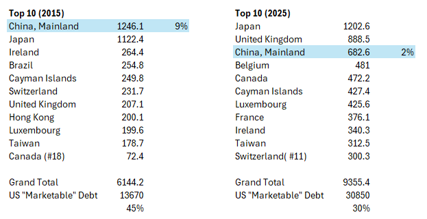 En très forte partie, la dette américaine est détenue par des intérêts américain. Ce n’est donc pas tout à fait exact de prétendre qu’une autre économie, par exemple la Chine car elle est souvent mentionnée ainsi, détient la dette américaine et qu’elle peut manipuler les USA à son gré. Prenons le cas de la Chine, directement. En 2015, avant la venue de M. Trump 1.0 la Chine détenait 1.2T de bon du trésor américain. Sur un total de 13.7T, cela correspondait à environ 9% de la dette. Aujourd’hui c’est vrai que la Chine a passablement réduit son exposition au trésor américain d’environ de moitié, et donc à 682 milliards, cela correspond à un maigre 2% de toute la dette. Ce n’est pas rien, mais ce n’est pas à mon avis suffisant pour faire bouger l’aiguille « tant que ça » (annexe4) Si les Chinois voulait vendre leur obligation, et « faire planter » leur marché obligataire, ça serait difficile. Oui, cela serait très volatile en bourse, mais je doute que cela soit une réelle possibilité.