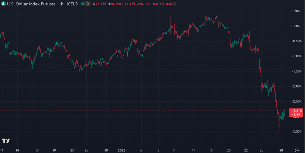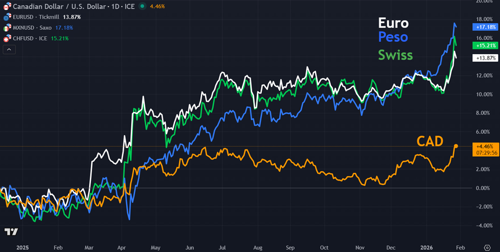 Ce que ça signifie : Quand actions, or, argent et platine montent en même temps, ce n’est pas un hasard, c’est un signal que le marché intègre une forme de dévalorisation progressive des devises et une recherche de réserves de valeur alternatives. D’ailleurs, un dollar plus faible entraîne mécaniquement une hausse des monnaies étrangères comme l’Euro, le franc Suisse, le dollar Canada, même le peso mexicain. En fait, le dollar CAD est possiblement une des devises qui ne progresse pas autant que les autres, possiblement à cause de la menace tarifaire direct qu’on subit à l’aube de la renégociation de la zone de libre-échange cette année (graphe6)