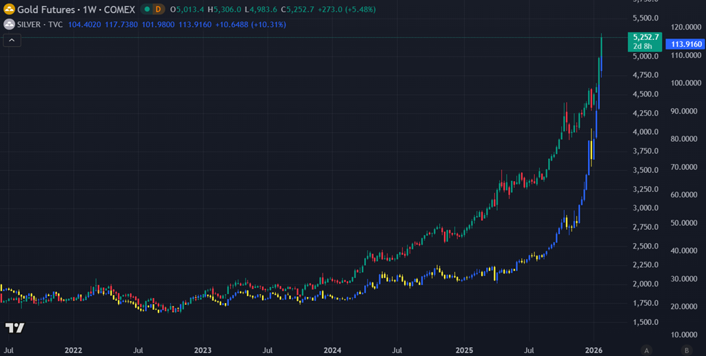 La hausse spectaculaire de l’or aujourd’hui près de 200$, nouveau sommet autour de 5 250 $/oz tout comme l’argent, le platine et plusieurs autres métaux, s’explique à mon avis par une raison dominante : la confiance envers les monnaies est durement ébranlée par les temps qui courent. C’est de moins en moins anecdotique, et de plus en plus inquiétant je trouve. (graphe1)