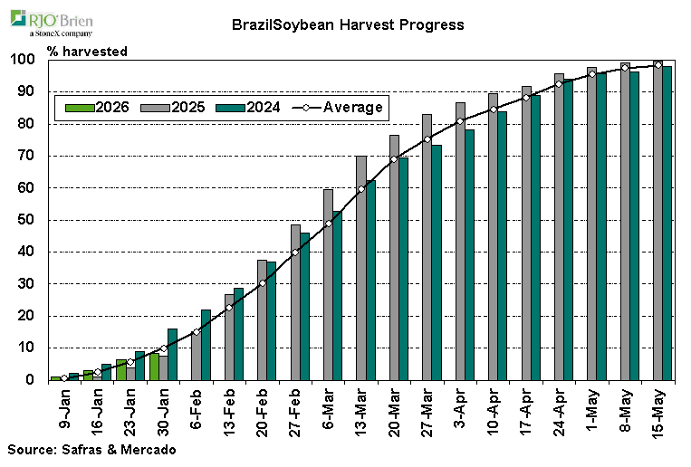 Le Brésil « l'acceptera-t-il » ? L'avenir nous le dira. Le Brésil devrait réaliser une récolte RECORD (178 millions de tonnes) et des exportations RECORD (114 millions de tonnes)… et environ 10 % de la récolte est actuellement effectuée (voir graphiques ci-dessous).
