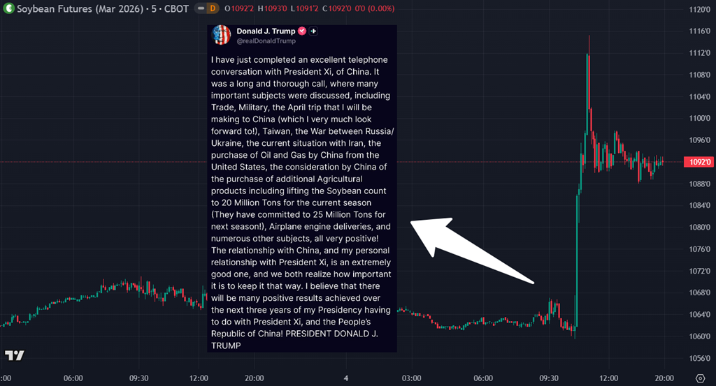En gros c’est pas mal ça le résumé de la journée : le tweet de M Trump qui a fait varier le cours du soja de manière assez violente aujourd’hui, un peu après l’ouverture des marchés ce matin.