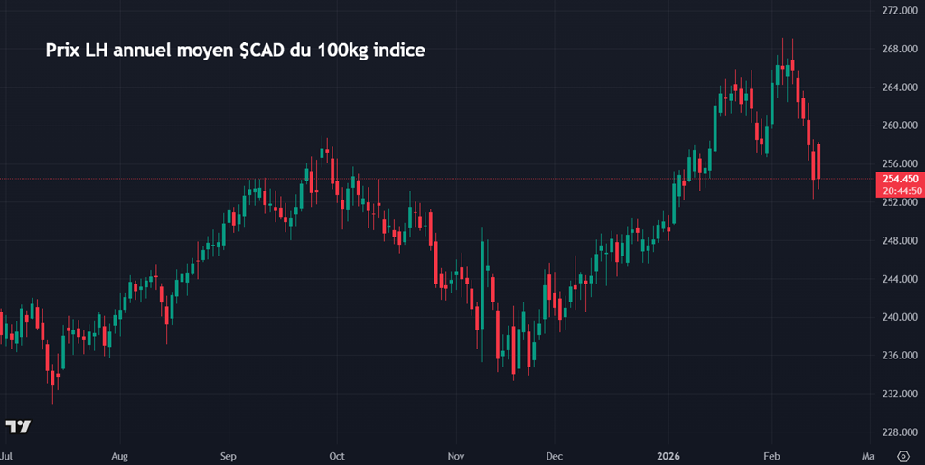 Si je fais une moyenne annuelle (estimation) de toutes les livraisons de l’année j’arrive à environ 254$ du 100kg. Et on pouvait « booker » au-dessus de 260$ pendant les 4 dernières semaines.
