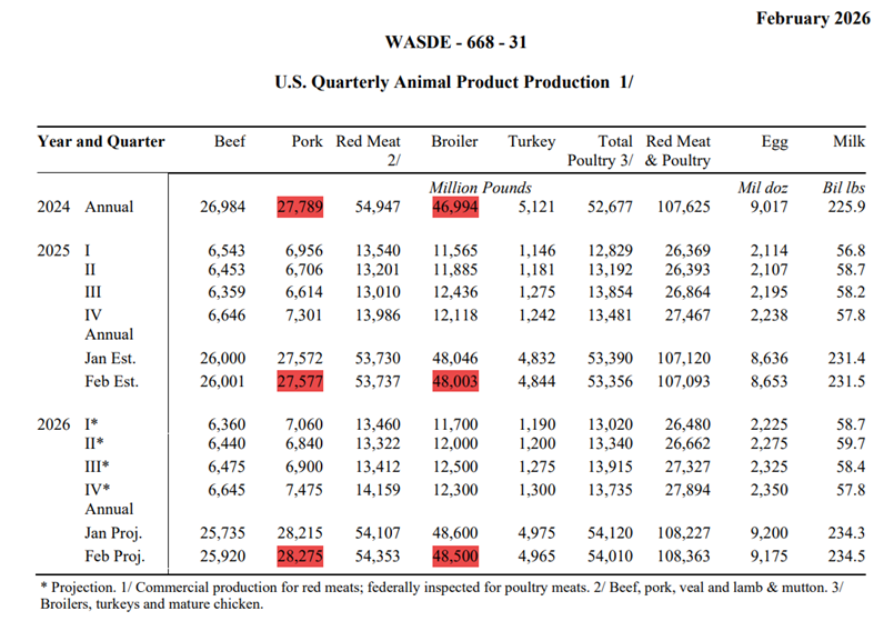Pourtant, le USDA prétend toujours que les producteurs produiront PLUS de porcs en 2026. A vrai dire, le USDA souligne que les producteurs produiront 2,5% plus de viande de porcs en 2026. Ce serait tout un retournement de tendance si cela devait se produire à notre situation présente.