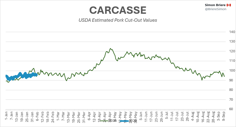 Si on tient compte des abattages? On peut difficilement différencier 2026 de 2025. Nous semblons avoir moins de porcs pour l’instant (1 jour d ‘abattage en moins en 2026). Mais des poids supérieurs, donc une quantité de viandes produite légèrement sous 2025. Mais tout juste par un cheveu.