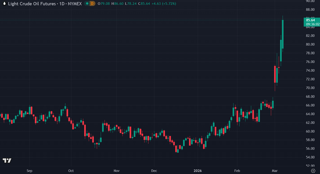 Le changement le plus visible est du côté de l’énergie. Le pétrole s’échange maintenant autour de 86 $ le baril, en forte hausse ce matin. Le contrat WTI est autour de 85,90 $, en hausse de près de 4,90 $ (+6 %) sur la séance. Après le mouvement initial de 65 $ vers 75 $ plus tôt cette semaine, le marché ajoute maintenant une nouvelle prime de risque géopolitique, reflétant une perception plus élevée de perturbation potentielle de l’offre au Moyen-Orient.