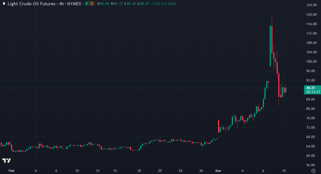 Du côté de l’énergie, le marché pétrolier a connu une séance très volatile hier. Après avoir atteint près de 120 $ le baril durant la nuit de dimanche, le pétrole a reculé avec l’apaisement relatif du ton politique. Ce matin, le contrat WTI se situe autour de 88 $, en baisse d’environ 6 % sur la séance. Une partie de la prime de panique du week-end s’est donc dissipée, mais le baril demeure tout de même très élevé comparativement aux niveaux autour de 65–70 $ observés il y a seulement deux semaines.