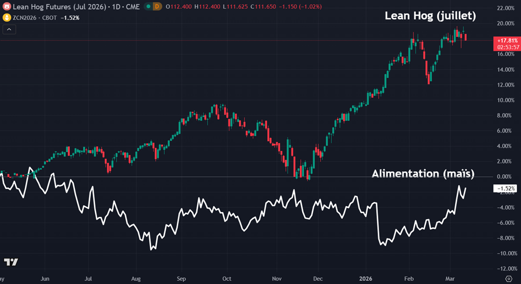 Depuis environ deux à trois ans, la première réalité est l’amélioration marquée des marges à la ferme. Après les sommets atteints par les coûts d’alimentation en 2021-2022 avec un maïs dépassant régulièrement 7,50 $ le boisseau et un tourteau de soya proche de 450-500 $ la tonne courte, les prix se sont normalisés. En 2024-2025, le maïs s’est davantage stabilisé dans une zone de 4,50 à 5,00 $, tandis que le tourteau oscillait autour de 320-350 $. Dans le même temps, les contrats Lean Hogs sont demeurés historiquement intéressants, souvent entre 90 et 110 cents la livre, avec des épisodes au-delà de 110 cents sur certaines échéances. Ce simple ajustement du spread prix du porc moins coût du feed a permis à plusieurs producteurs de retrouver une profitabilité tangible. Les flux de trésorerie se sont améliorés, l’endettement accumulé durant les années difficiles a commencé à diminuer et les décisions d’investissement sont redevenues possibles, même si elles restent prudentes.
