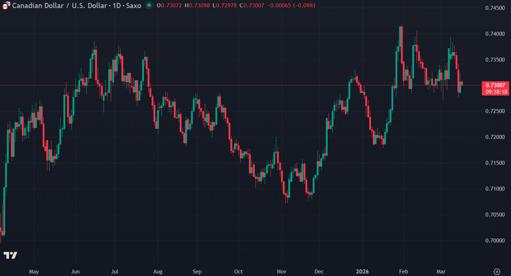 Le dollar canadien s’affaiblit légèrement vers 0,733, malgré la hausse du pétrole, signe qu’un climat global prudent continue de favoriser le dollar américain.