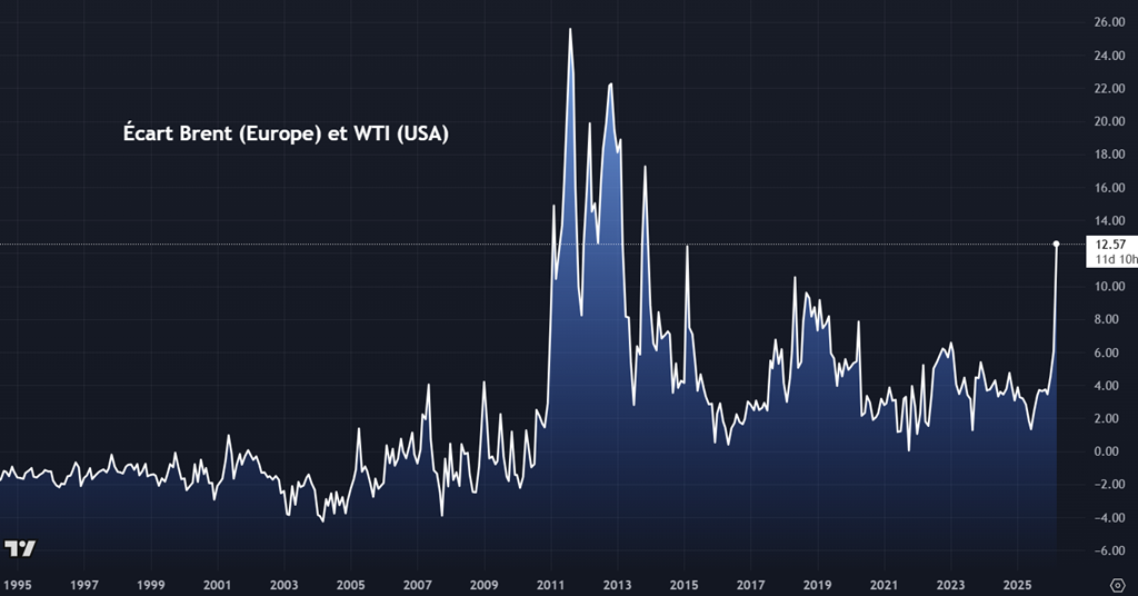 L’écart entre le pétrole Brent (référence européenne) et le WTI (référence américaine) s’est fortement élargi récemment, ce qui reflète une réalité géopolitique et énergétique très différente des deux côtés de l’Atlantique.