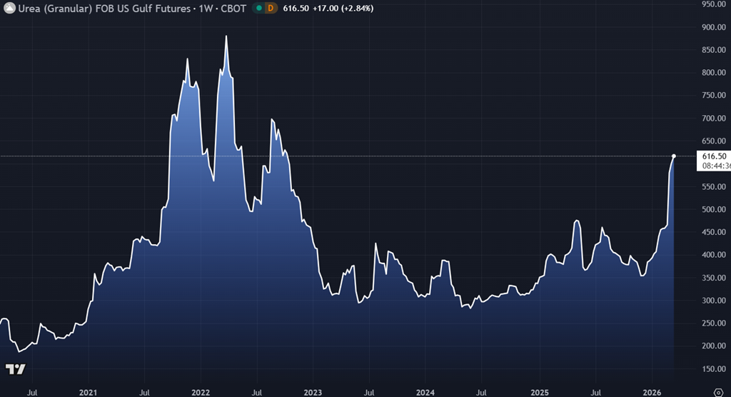 Mention aussi du côté des fertilisants. On observe un rebond notable de l’urée et plus largement des engrais azotés, principalement en réaction à la hausse du gaz naturel et aux tensions géopolitiques sur l’énergie. Comme la production d’azote est directement liée au coût du gaz, ce segment demeure beaucoup plus sensible aux chocs énergétiques à court terme.